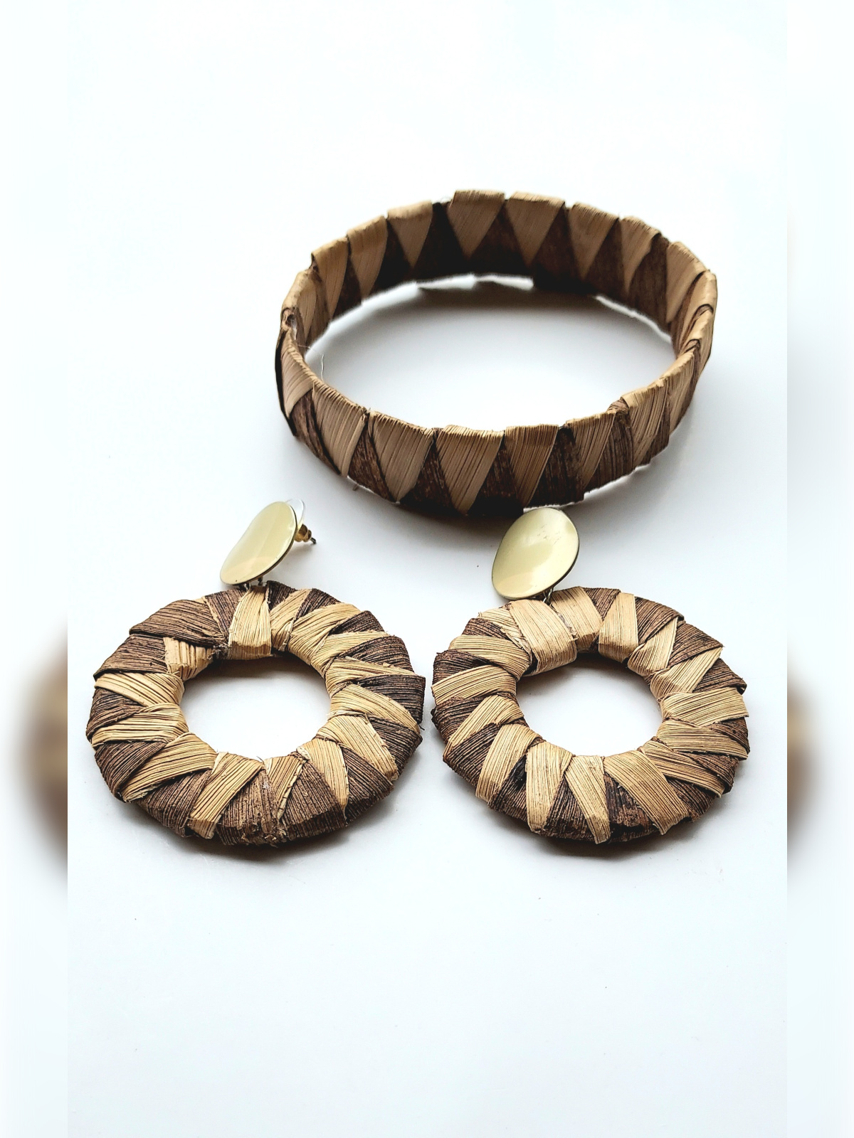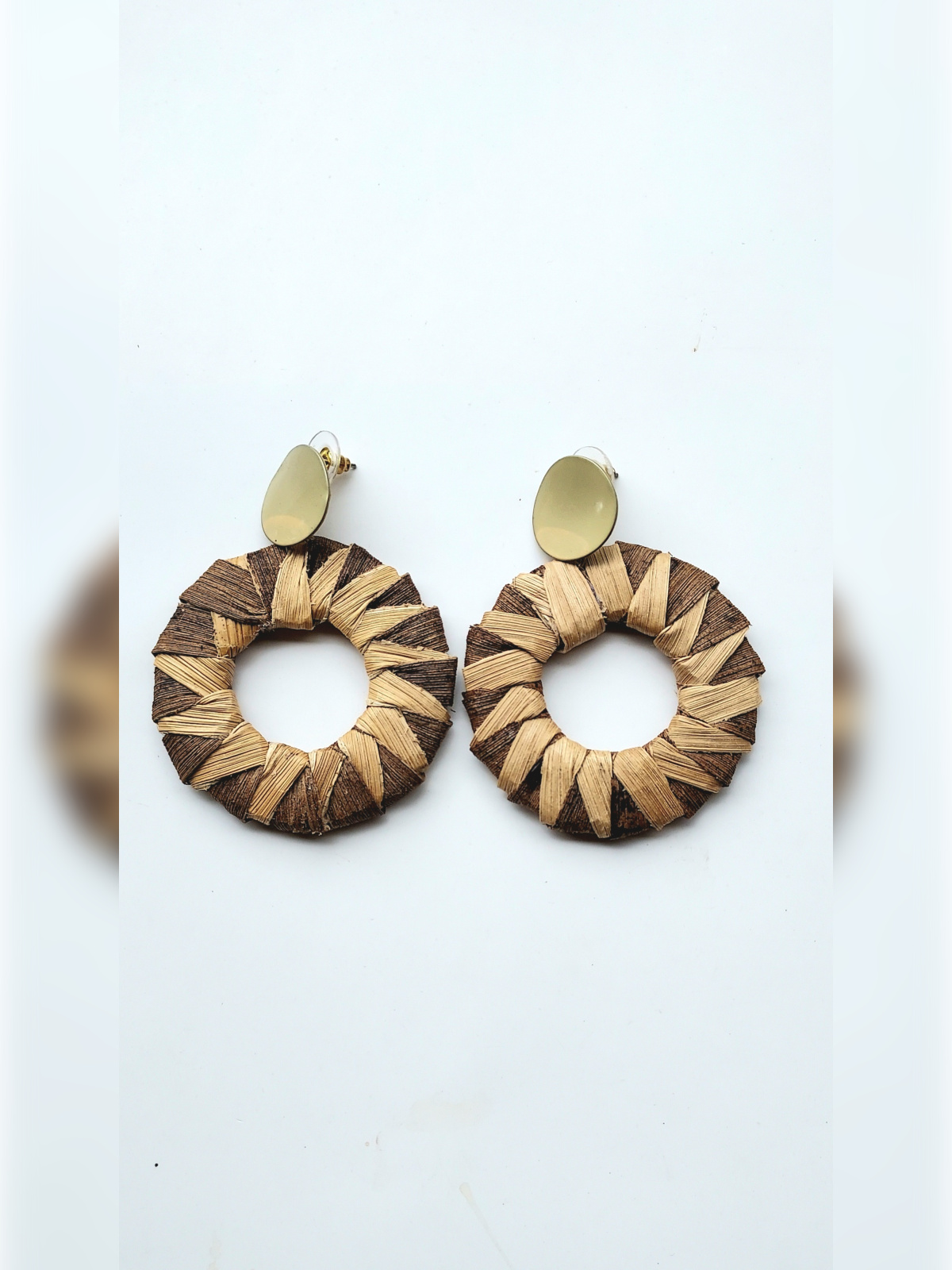 – Boucles d’oreilles : forme ronde, diamètre env. 5 cm, attache clou doré