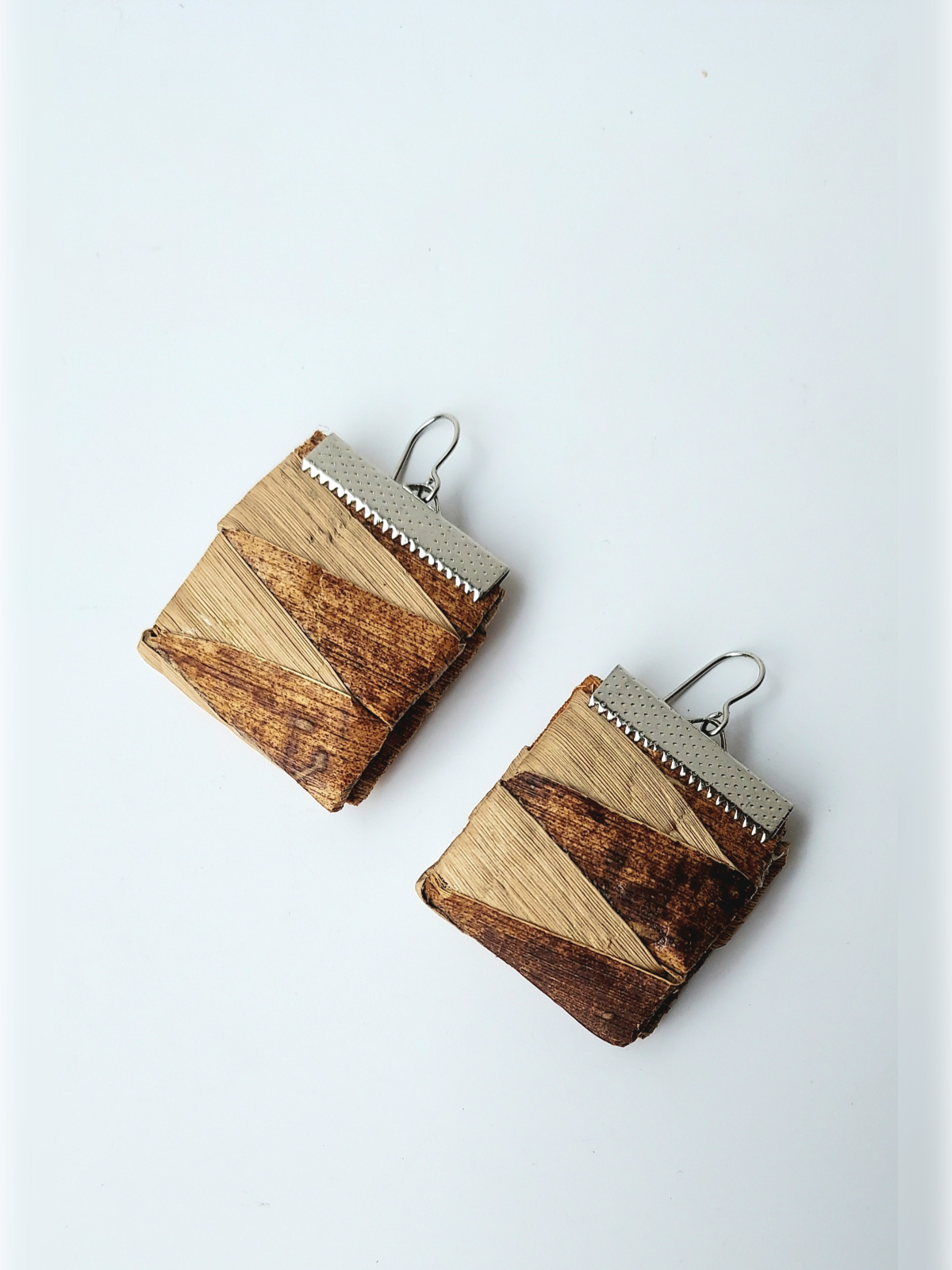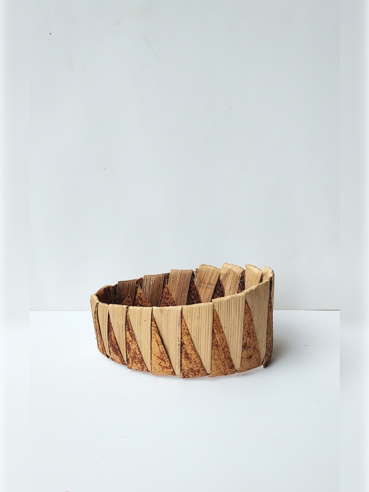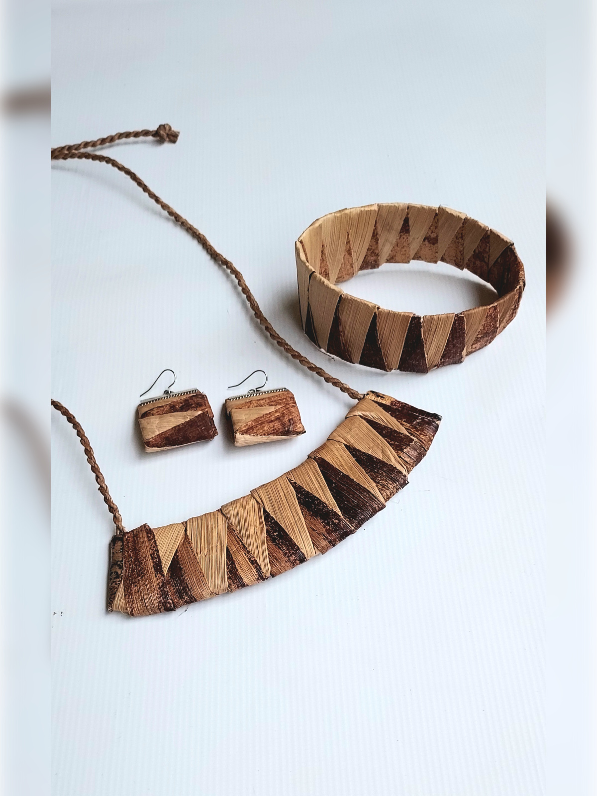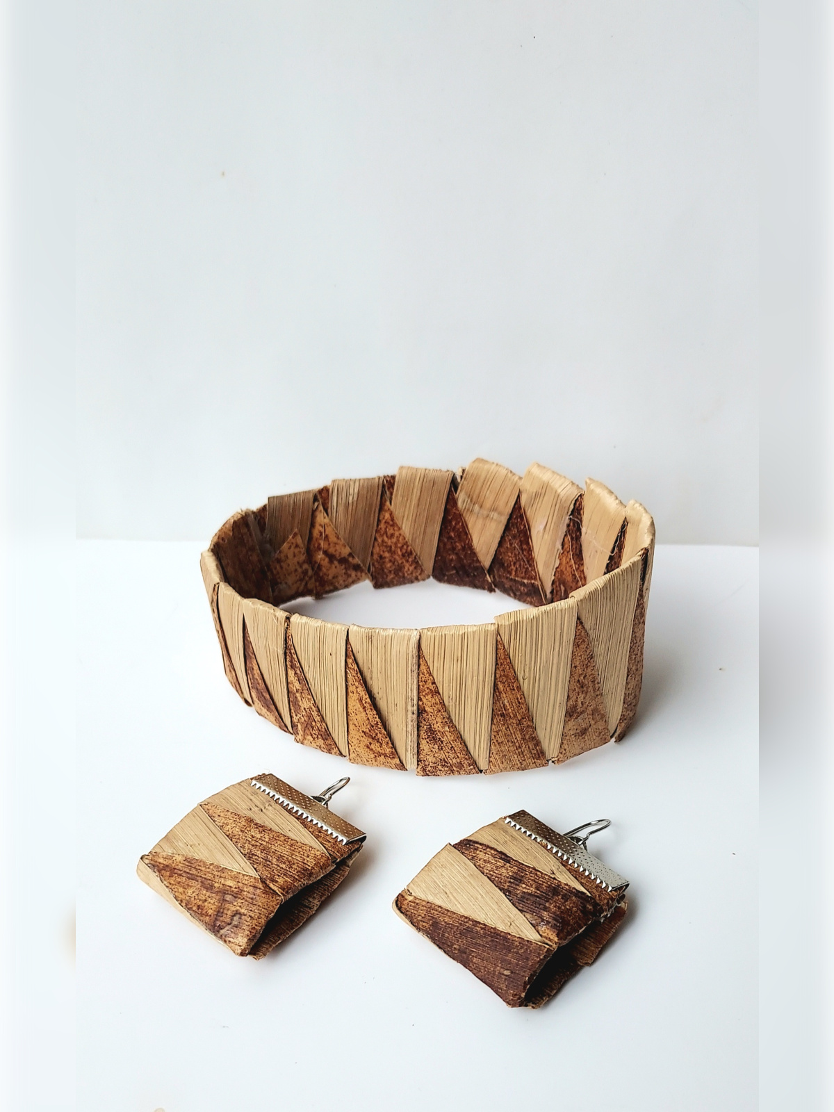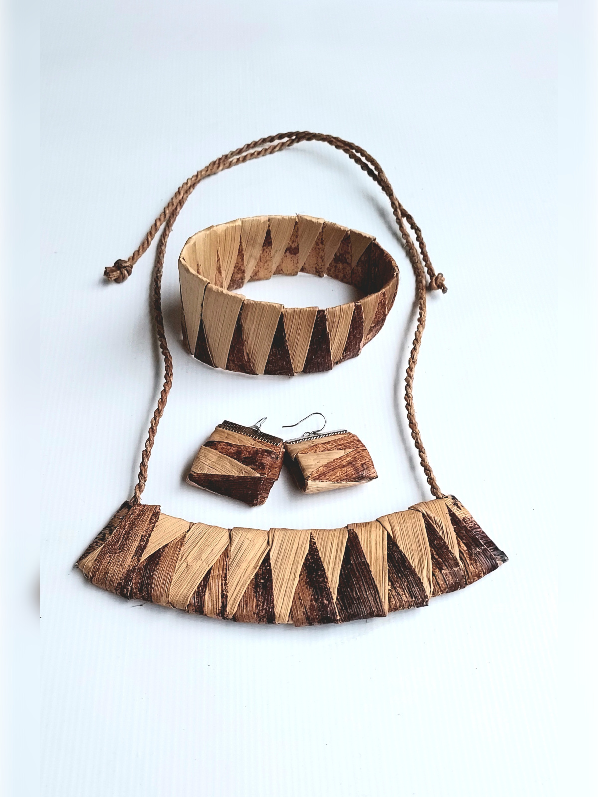 Cet ensemble original Triangula est entièrement réalisé à la main à partir de fibres de bananier soigneusement travaillées. Il comprend un collier structuré, un bracelet rigide à motifs géométriques distinctifs et une paire de boucles d’oreilles assorties.